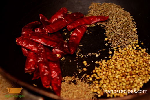 - In a pan slightly roast cumin, carom and coriander seeds and red chillies