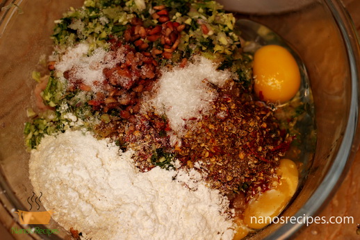 - In a big bowl, mix all ground spices and chopped material with minced meat