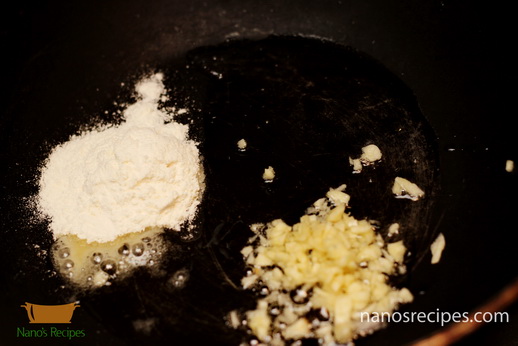 - Heat one tablespoon butter in pan and add grated garlic and flour