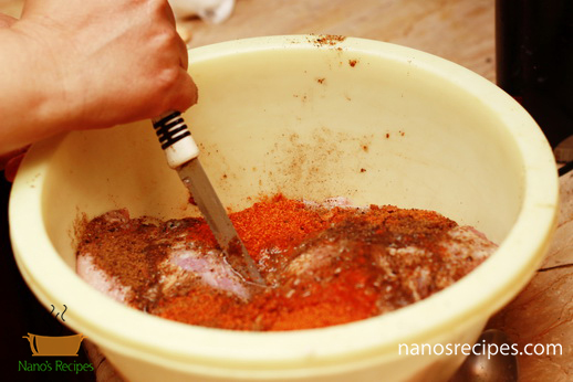 - Prick the beef with a knife. Add half of the spices including kalmi shora, salt and red chilli and 1/4th Cup of lemon juice and continue pricking so that the spices go inside the meat