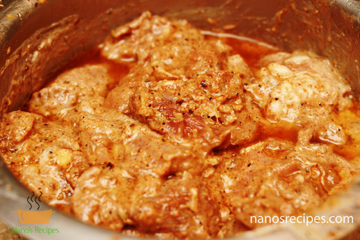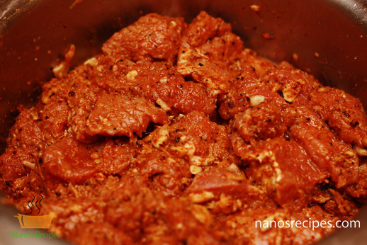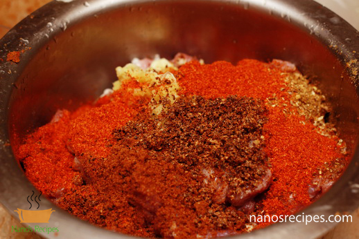 - Apply the spices over the meat and add lemon juice, ginger and garlic paste to it. Mix thoroughly and let it marinate for 2 hours