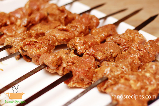 - Skew the marinated meat over skewers in such a manner that they don't slip when you twist the skewers. Skew the meat length wise.