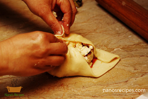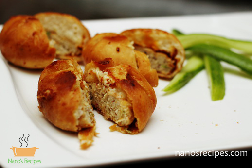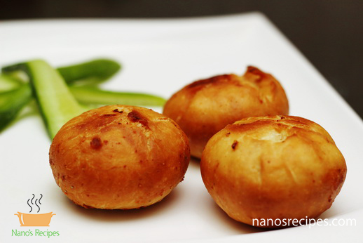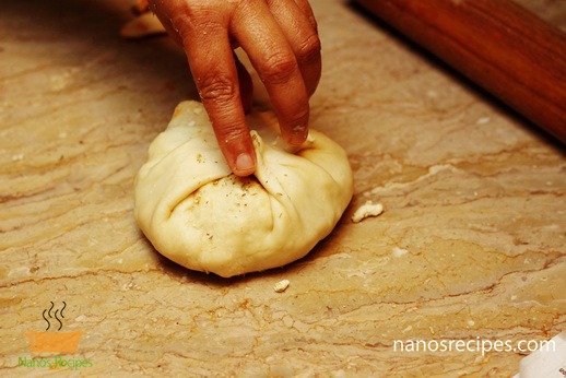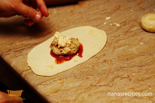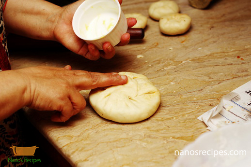 - Divide each portions into small three portions and roll out each of them. Repeat the process as given above till filling, Gather the edges and shape them into a burger