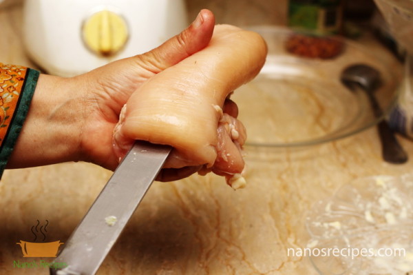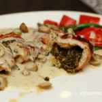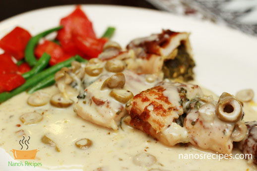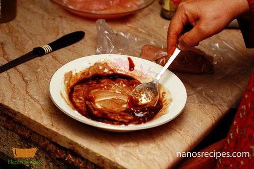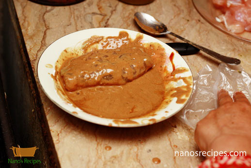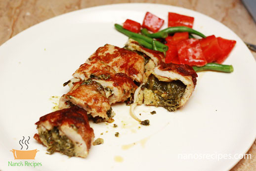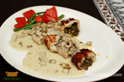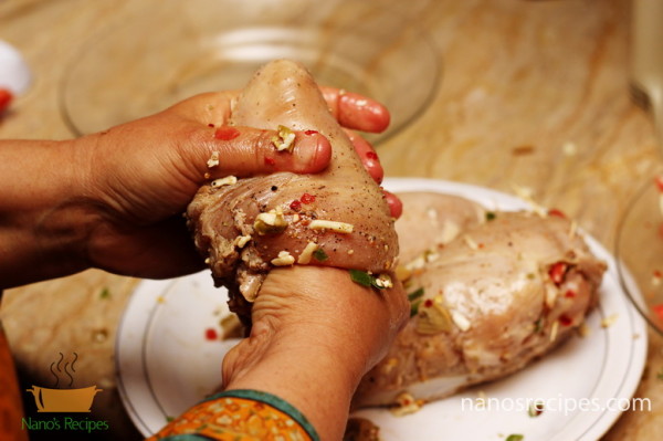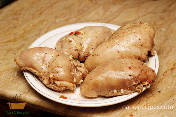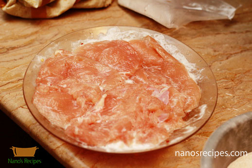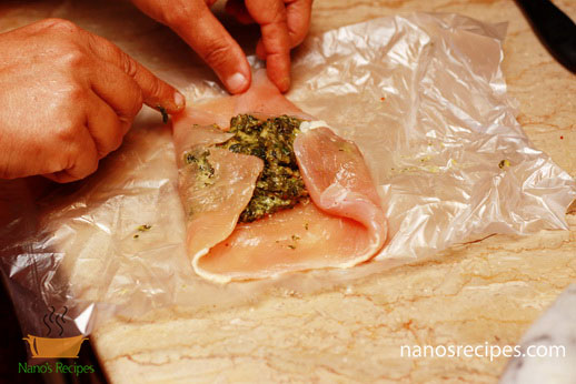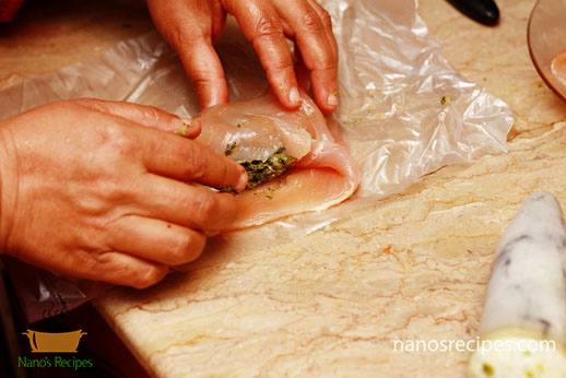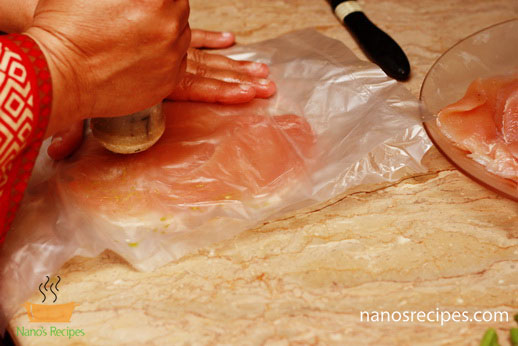 1. You can use whole chicken breast or you can use thin slices of breast. If you are using whole breast than hollow it with the help of knife as shown in picture. Or you can make thin large slices splitting the breast like a book.