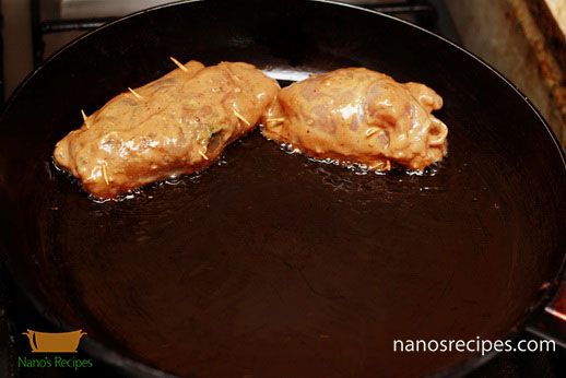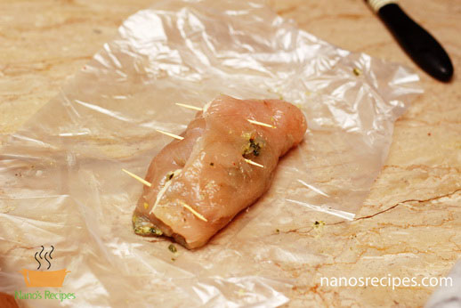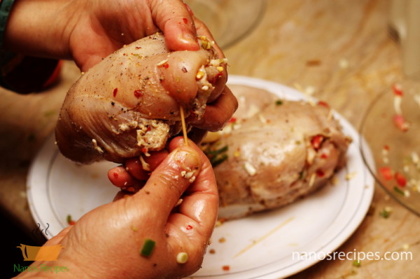 7. If you take whole breasts then fill it with filling as shown in picture and close the opening with tooth picks