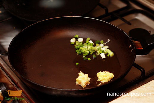 3. Prepare filling by heating one Tablespoon olive oil and add garlic, ginger and green onion. Saute a little