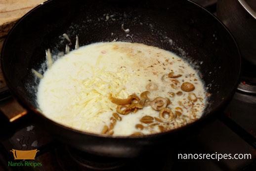 16. Add black pepper, thyme, oregano, olives at the end add cheese and remove from heat