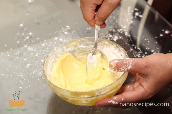 - Melt the butter slightly and beat it till it becomes fluffy. Add the corn flour little by little while beating the butter till all the corn flour is added. Then refrigerate.