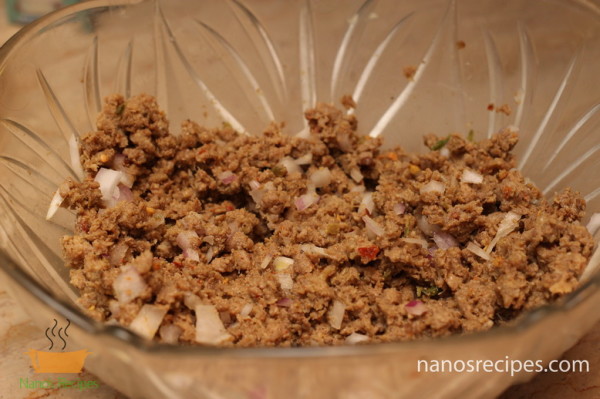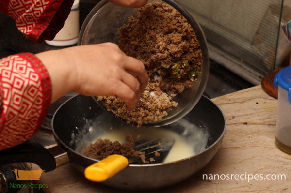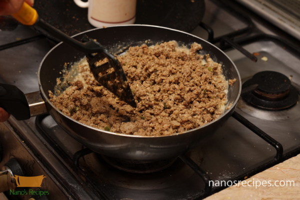 - Remove from heat and stir so that all lumps are well dissolved. Add the cooked minced meat into this mixture and cook again. Keep your filling moist and easy to fill. You can adjust spices according to your taste.