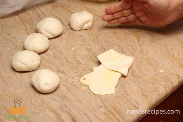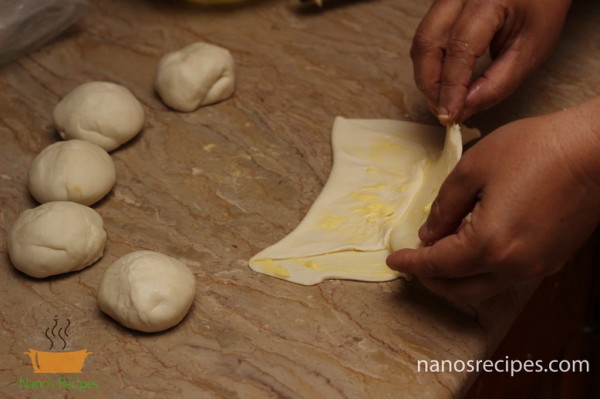 - Divide the dough into six balls. Roll out each ball and apply butter on it.