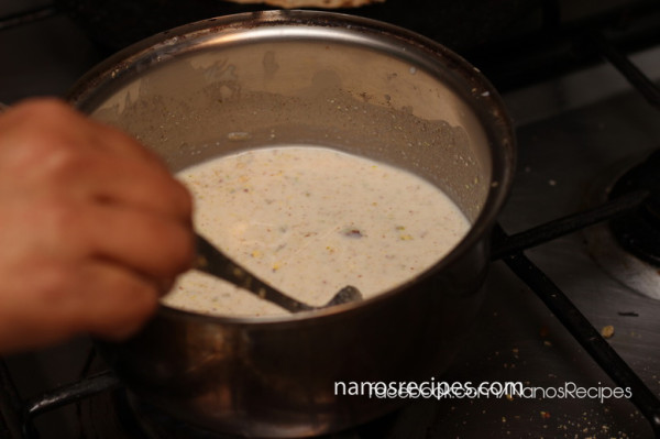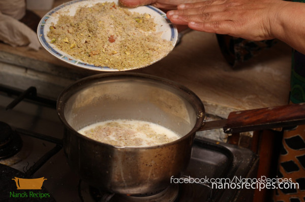5. Add powder milk to the milk. Heat the milk with 2-1/2 Tablespoons of sugar that you ground
